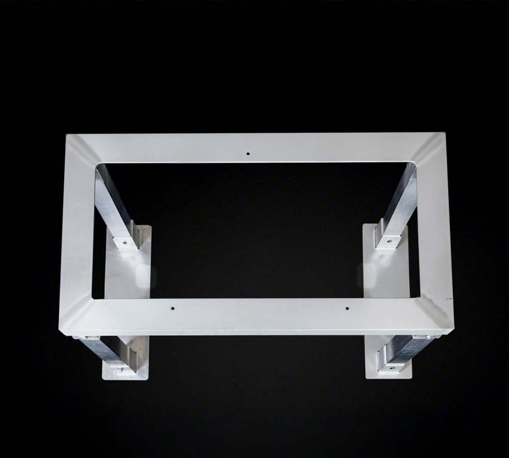 - Constructed with 4″ x 3″ x 1/4″ angle top frame, 3″ x 3″ x 3/16″ leg tubes, and two 28″ x 8″ x 1/4″ mounting plates.